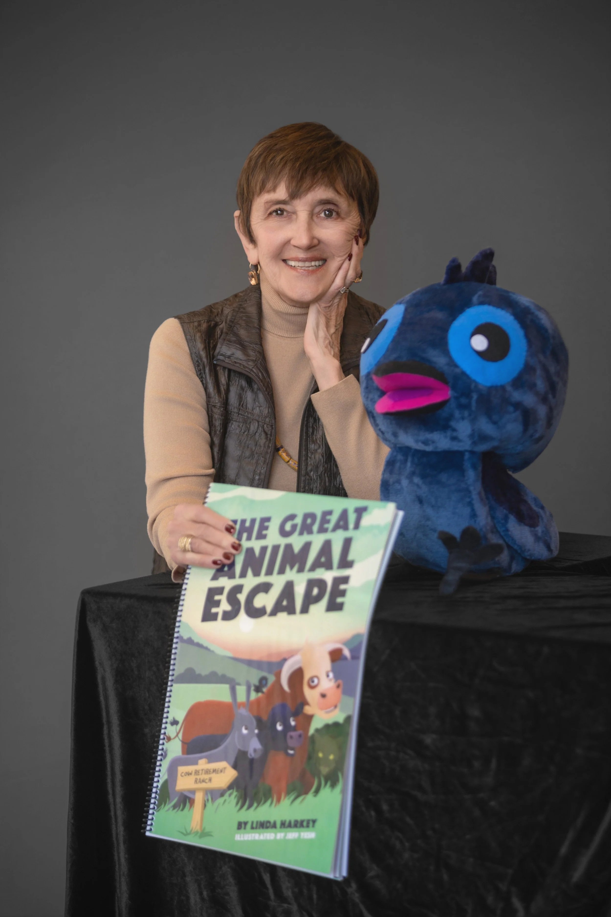 linda harkey, Award-winning author of the great animal escape, with her custom puppet creation and oversized book designed by story monsters LLC